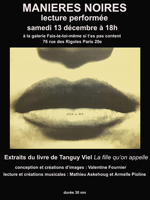 MANIÈRES NOIRES, projet de lecture musicale autour du livre de Tanguy Viel "La fille qu'on appelle" (éditions de Minuit, 2021). Musicien.nes : Mathieu Askehoug et Armelle Pioline : Restitution de résidence au Pavillon de Romainville 93230, le vendredi 16 décembre 2022 à 16h