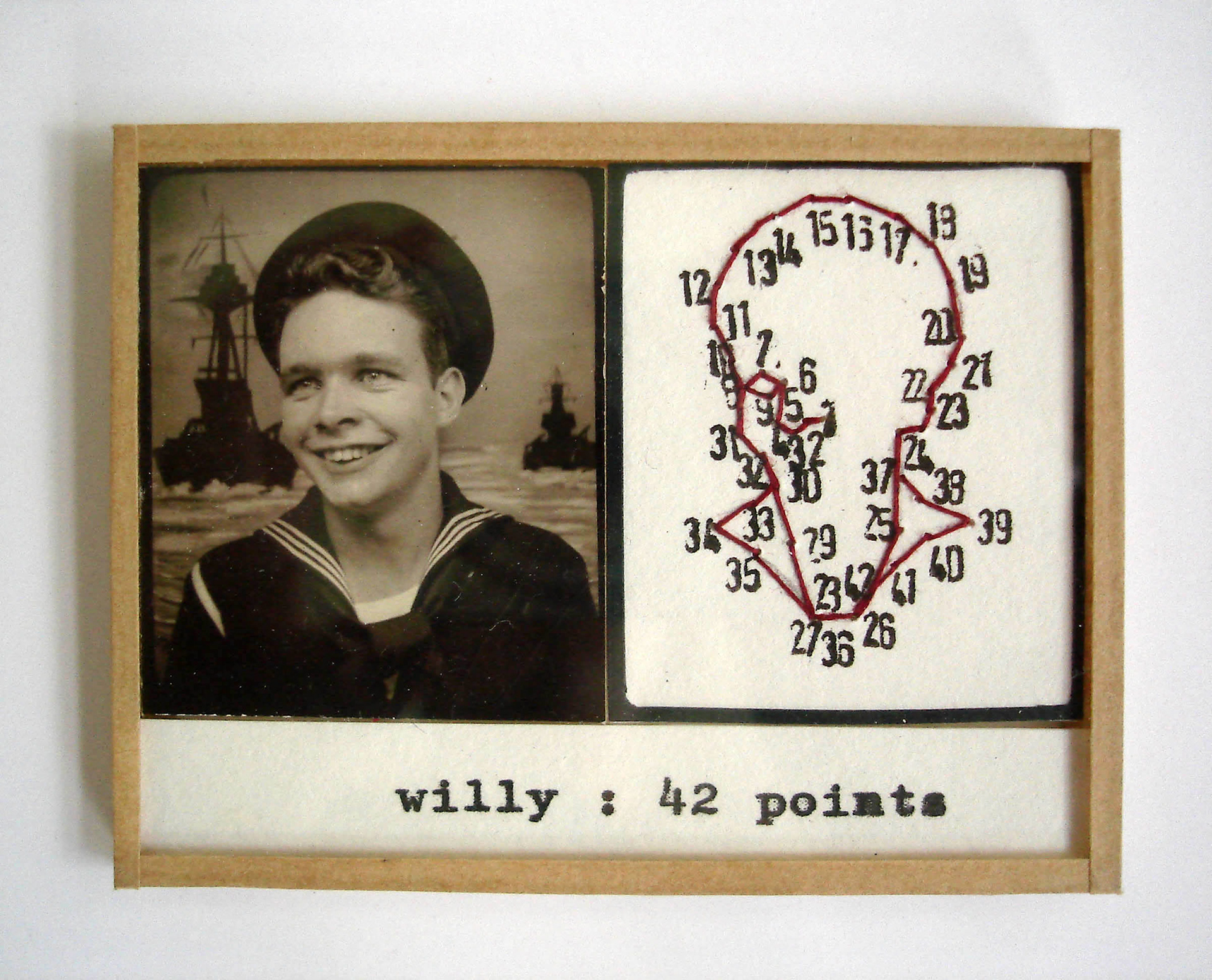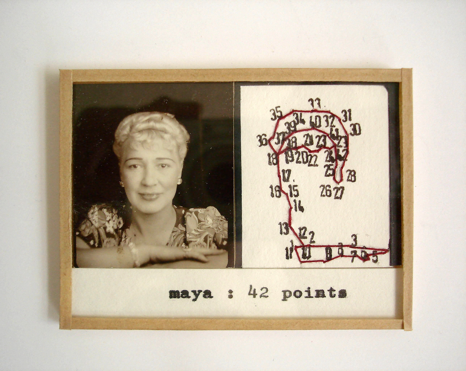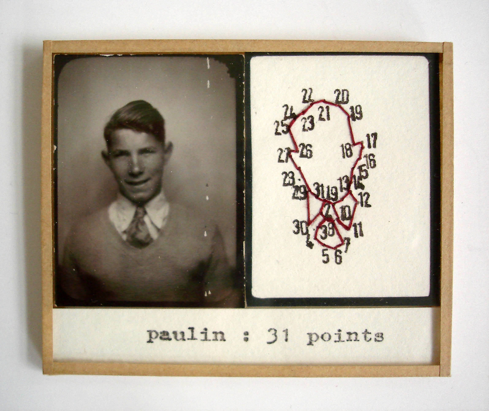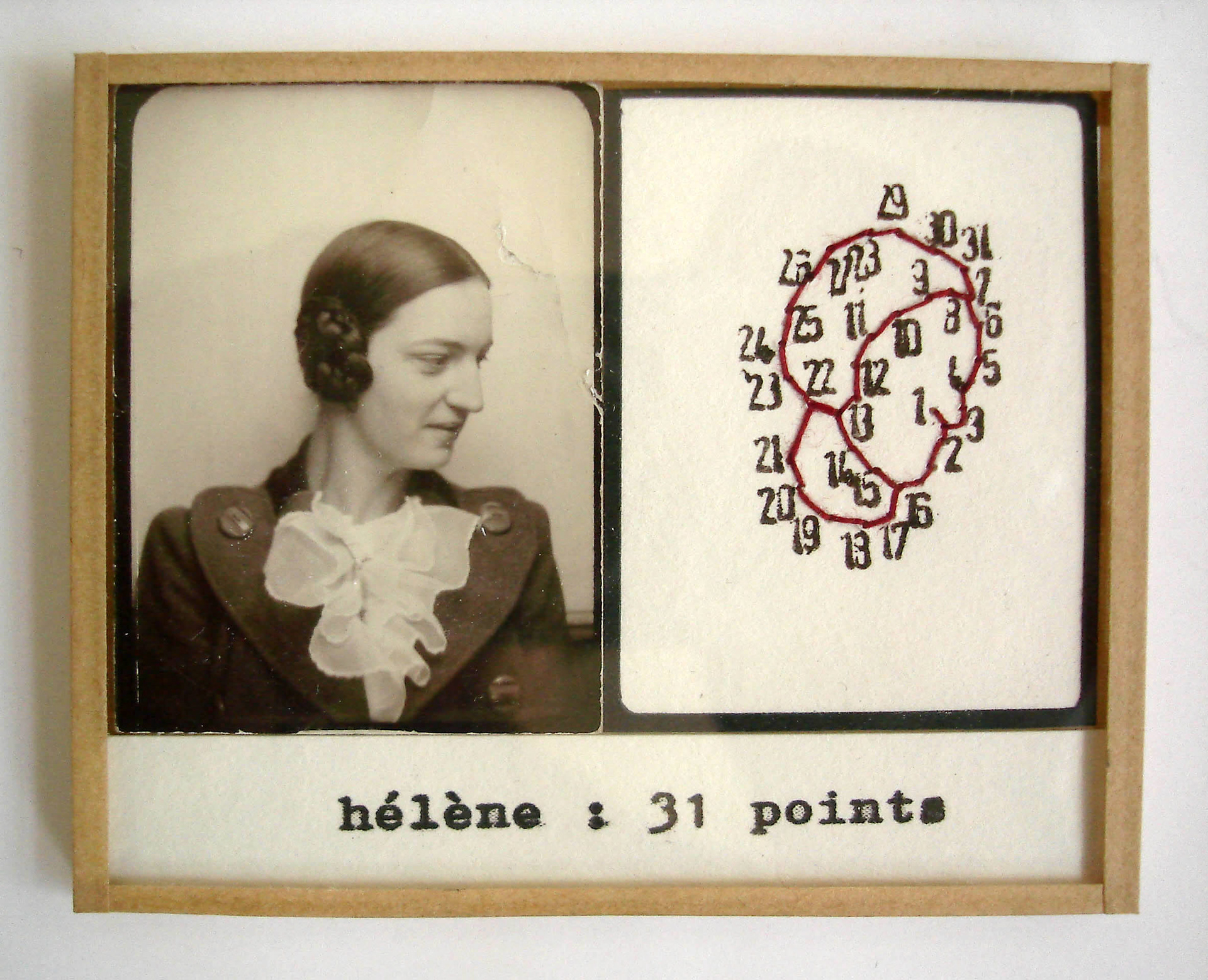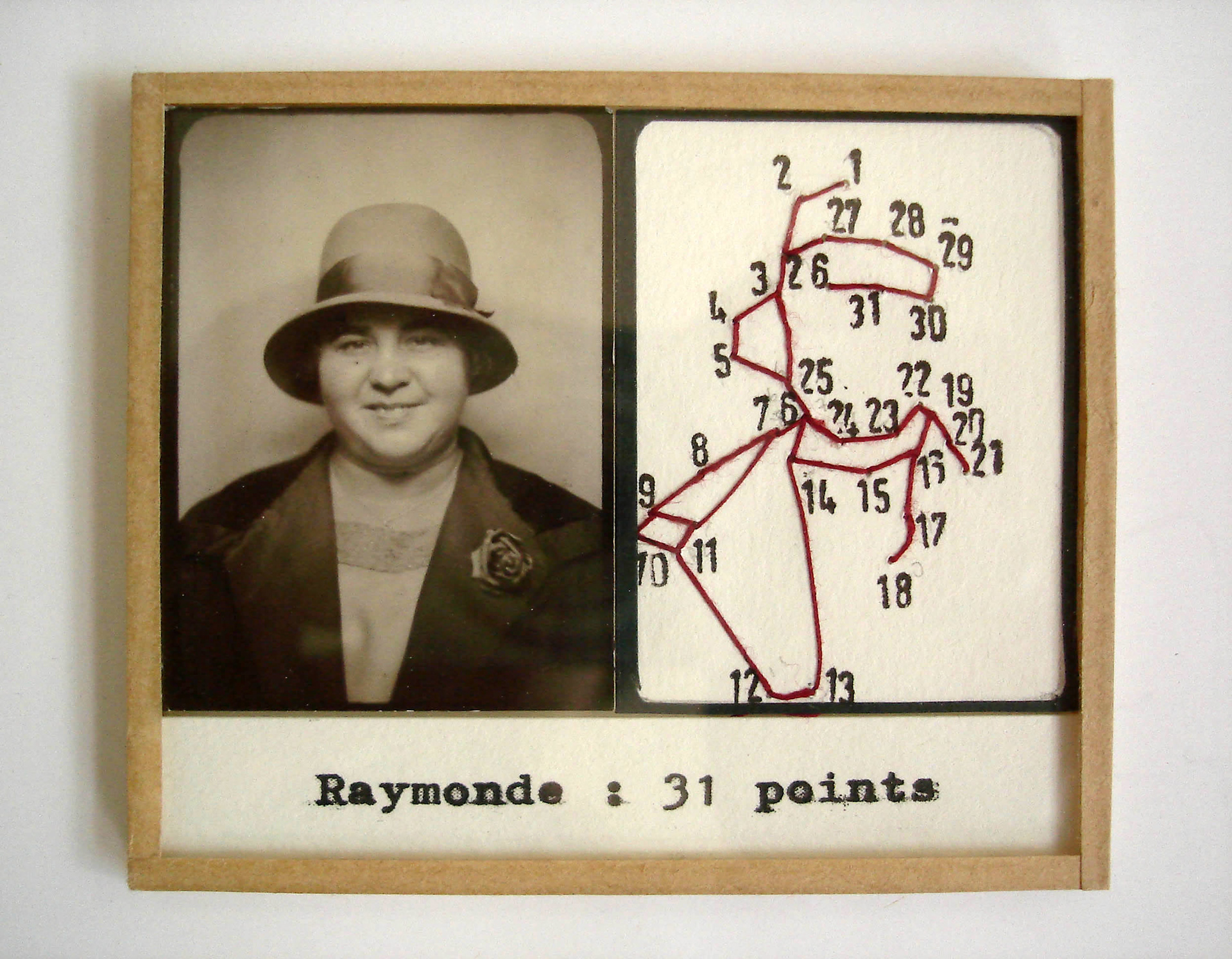 Depuis 2000, l’artiste française Valentine Fournier développe tout un art de la mise en scène en miniature et choisit pour protagonistes des portraits anonymes des années 1920-1950. La série des petits cadres est consacrée aux portraits photomaton. Valentine Fournier s’inspire du jeu traditionnel enfantin consistant à relier des points numérotés pour faire apparaître un dessin et reproduit la silhouette des personnages portraiturés. Si l’approche paraît ludique, ces dessins codés, ainsi que la typographie employée, font référence au dispositif normatif de la photographie d’identité. Ces silhouettes vides, composées de chiffres, contrastent avec les visages expressifs des portraits originaux et semblent dénoncer le caractère réducteur de ce mode d’identification imposé par l’état civil. Le titre donné aux pièces, un prénom suivi du nombre de points utilisés, reflète tout particulièrement cette tension.