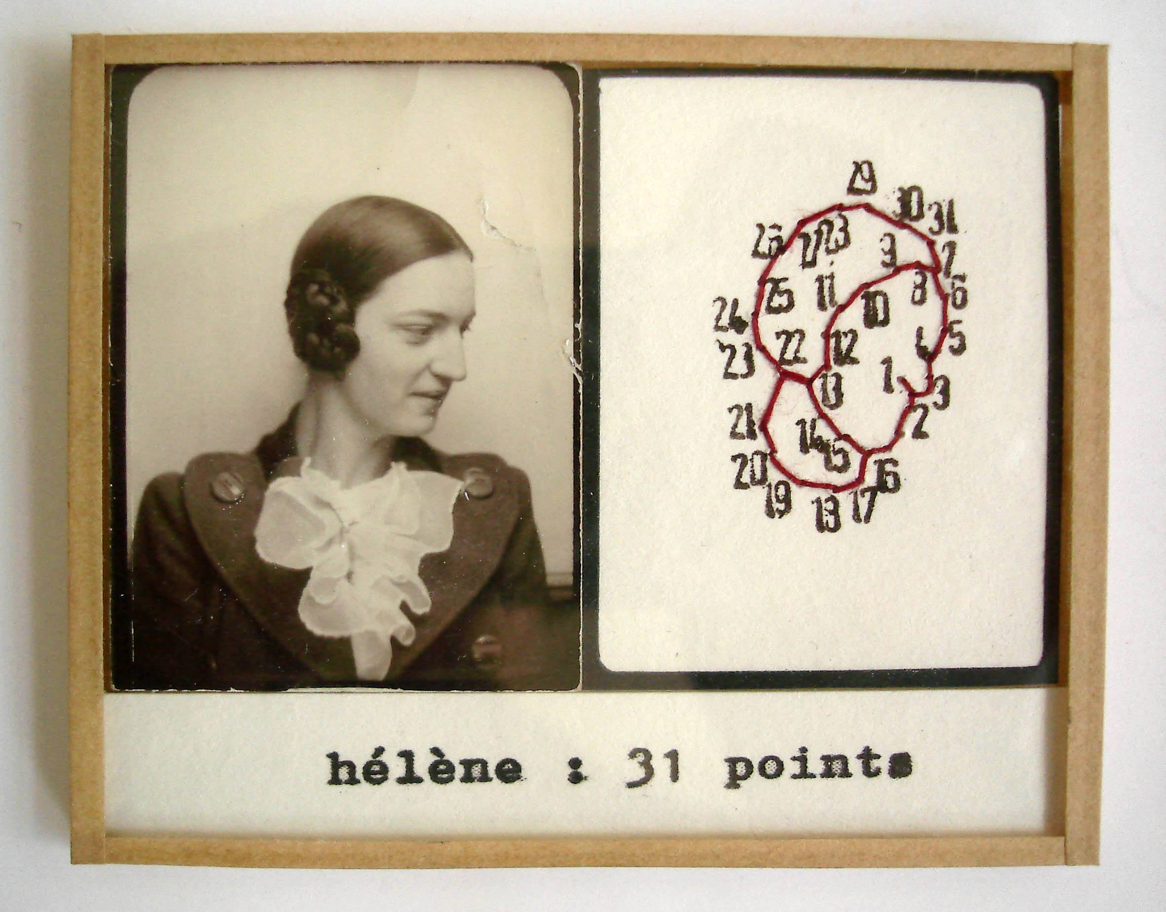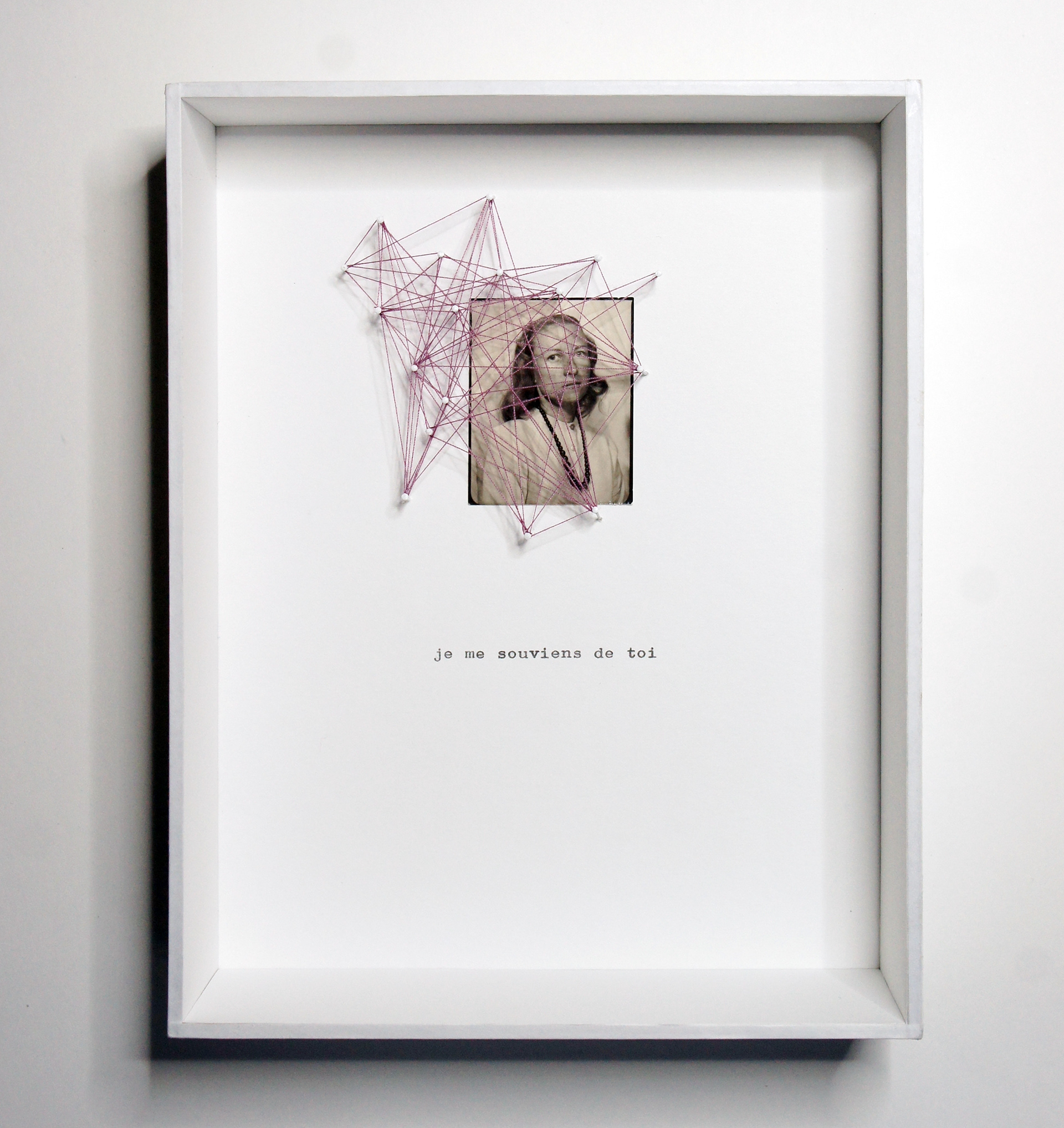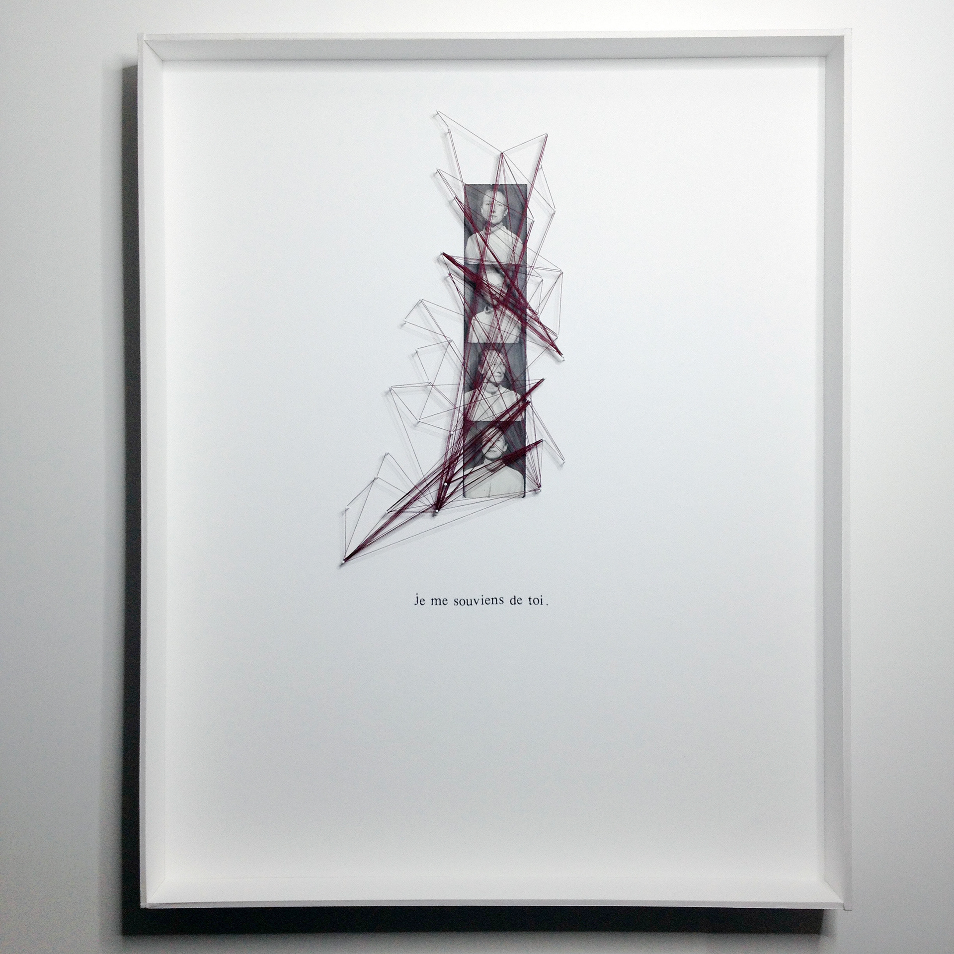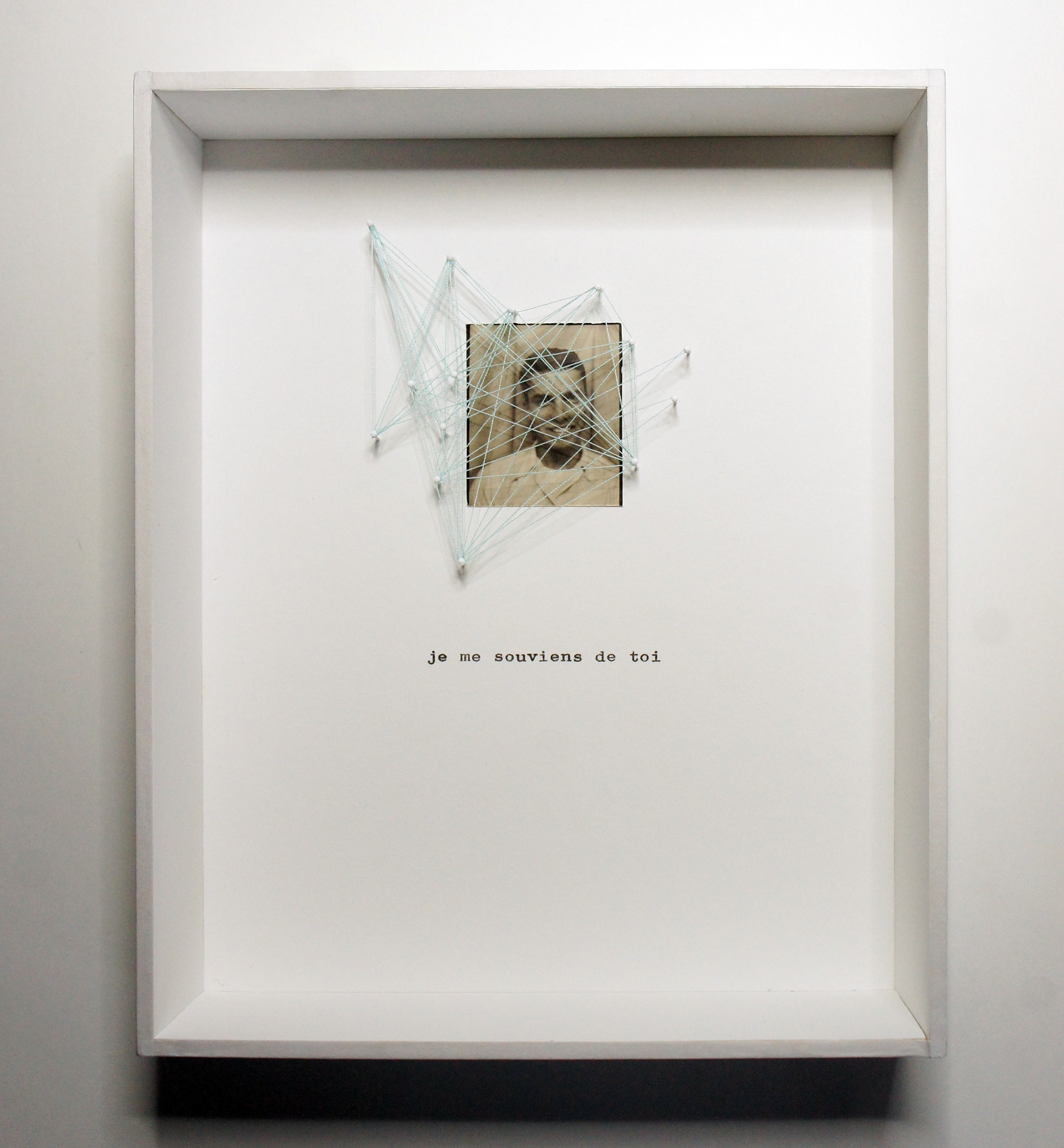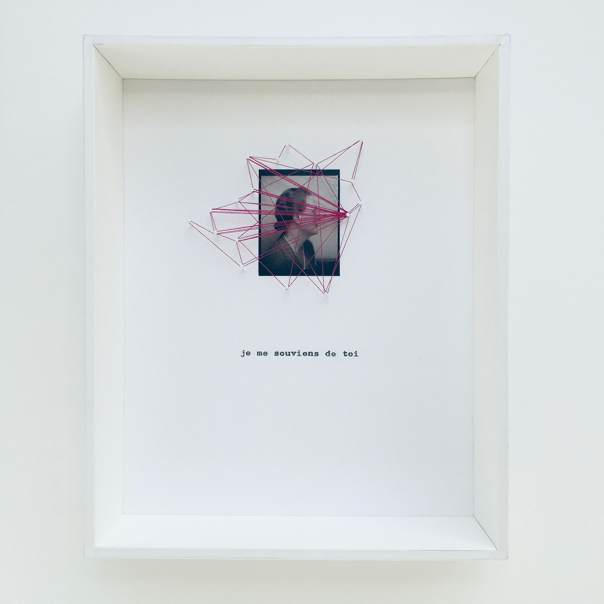 Je me souviens de toi - Format : 20 x 30 x 4 cm - Techniques : Photo d'identité originale, fil, encre, papier, carton.