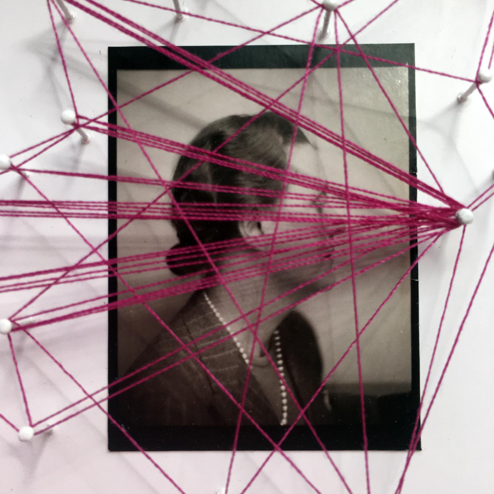 Une nouvelle fois dans mon travail j'utilise le fil comme matériau qui évoque le temps. Les fils passent et se croisent devant le portrait. Ne restent visibles parfois que quelques détails, comme un effacement, un visage qu'on oublie. 2016/2021