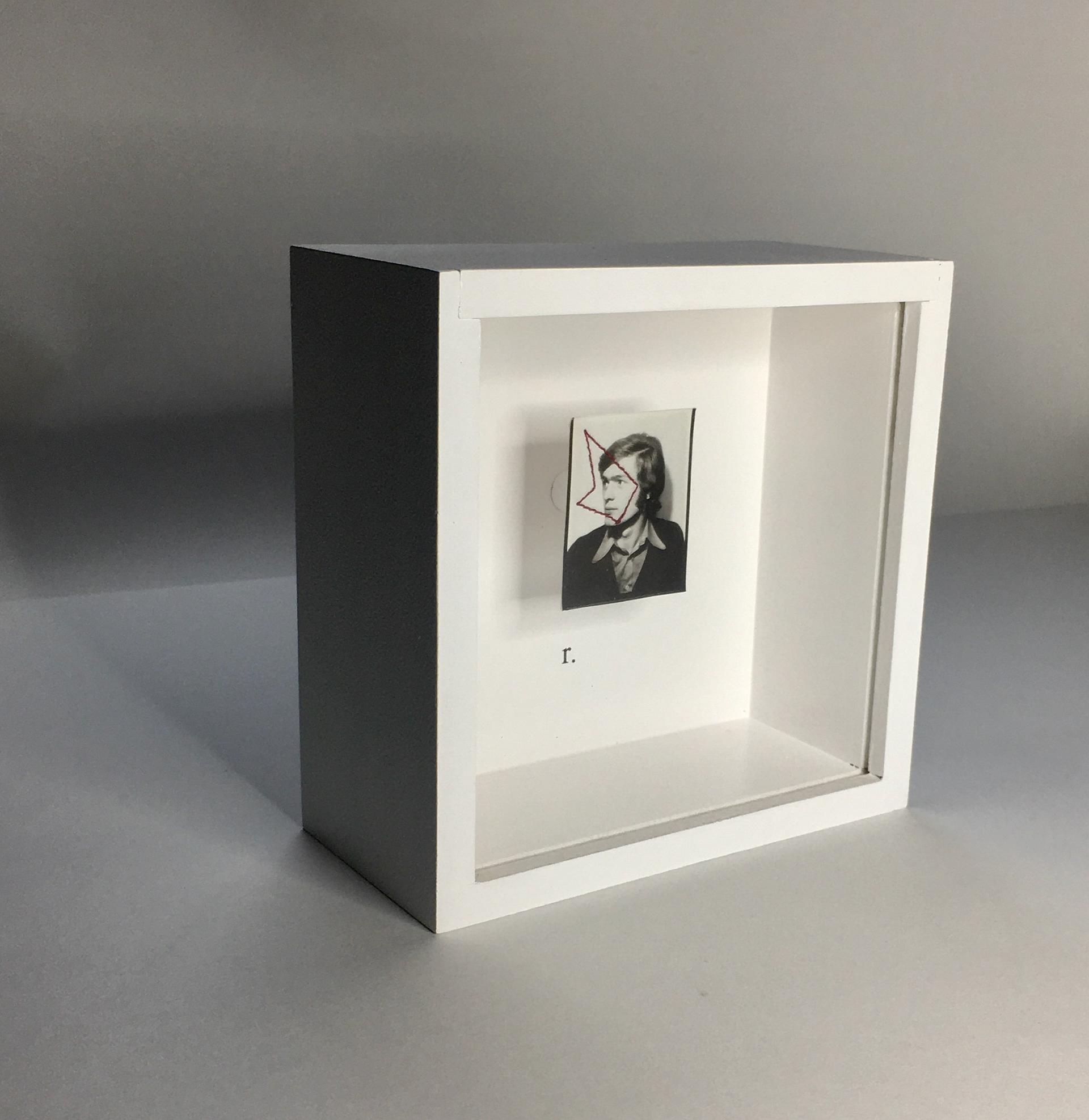 Format : 110 x 30 x 10 cm - Techniques : Photomaton originaux, Letraset, fils, boîte en médium peinte.