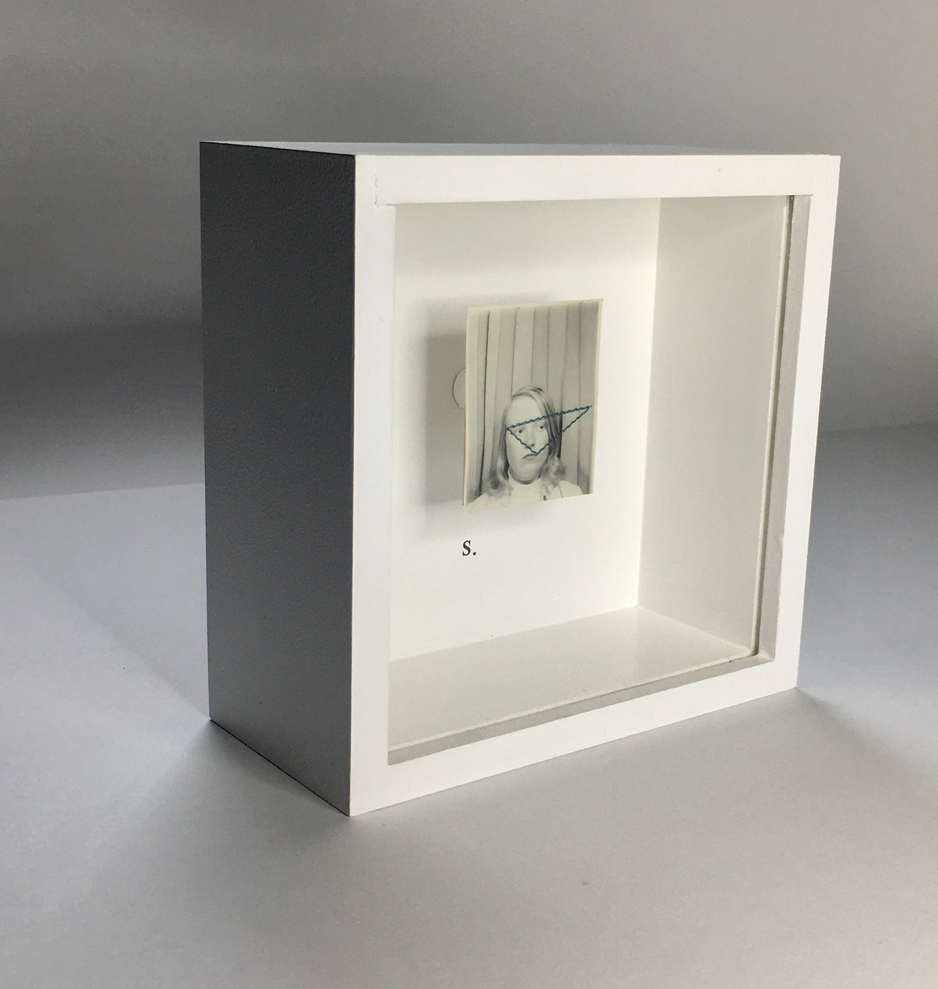 Formats : 15 x 15 x 7 cm - Techniques : Photomaton originaux, fil, boîte en médium peinte.