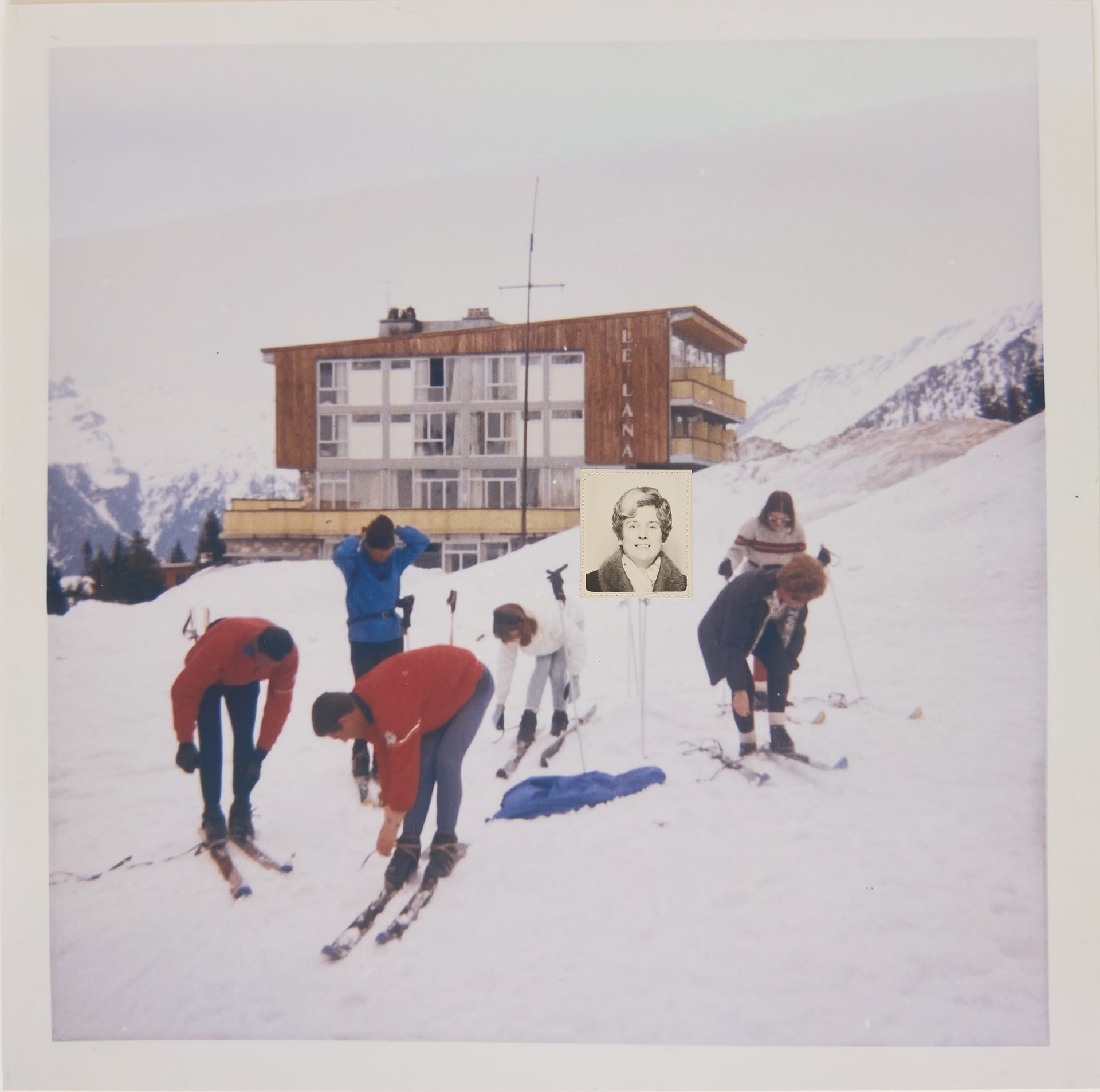 Souvenir de la neige. Format : 40 x 40 x 2 cm. Reproduction d'une photographie, photo d'identité originale, fil.