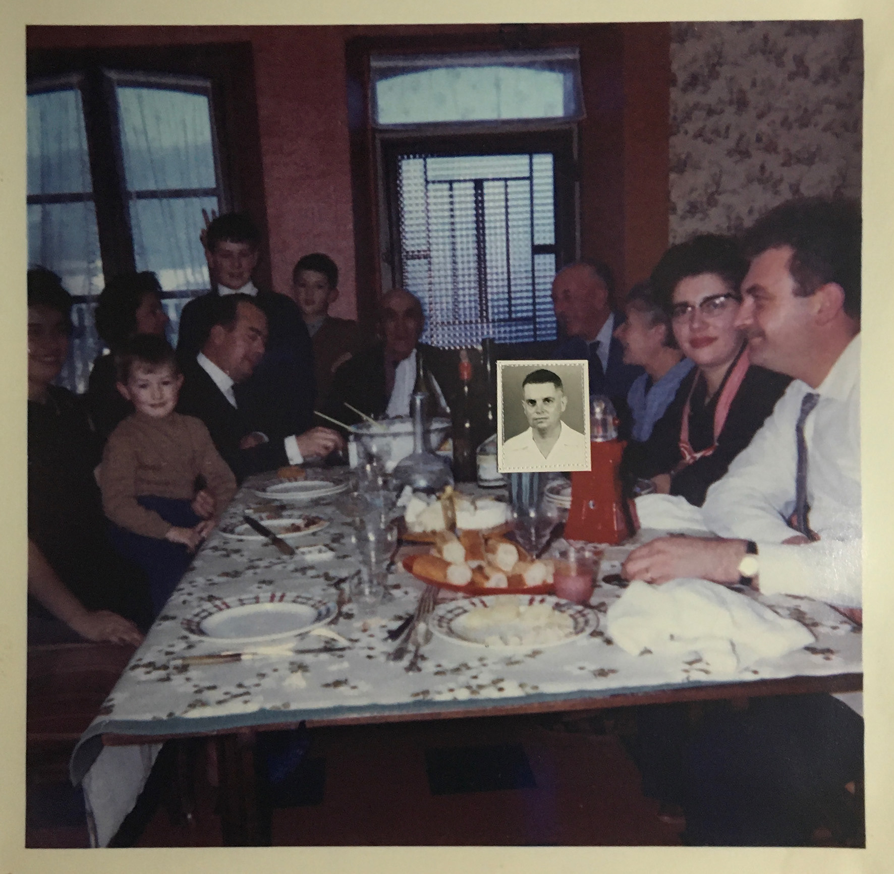 Souvenir du repas. Format : 40 x40 x 2 cm. Techniques : Reproduction d'une photographie, photo d'identité originale, fil.