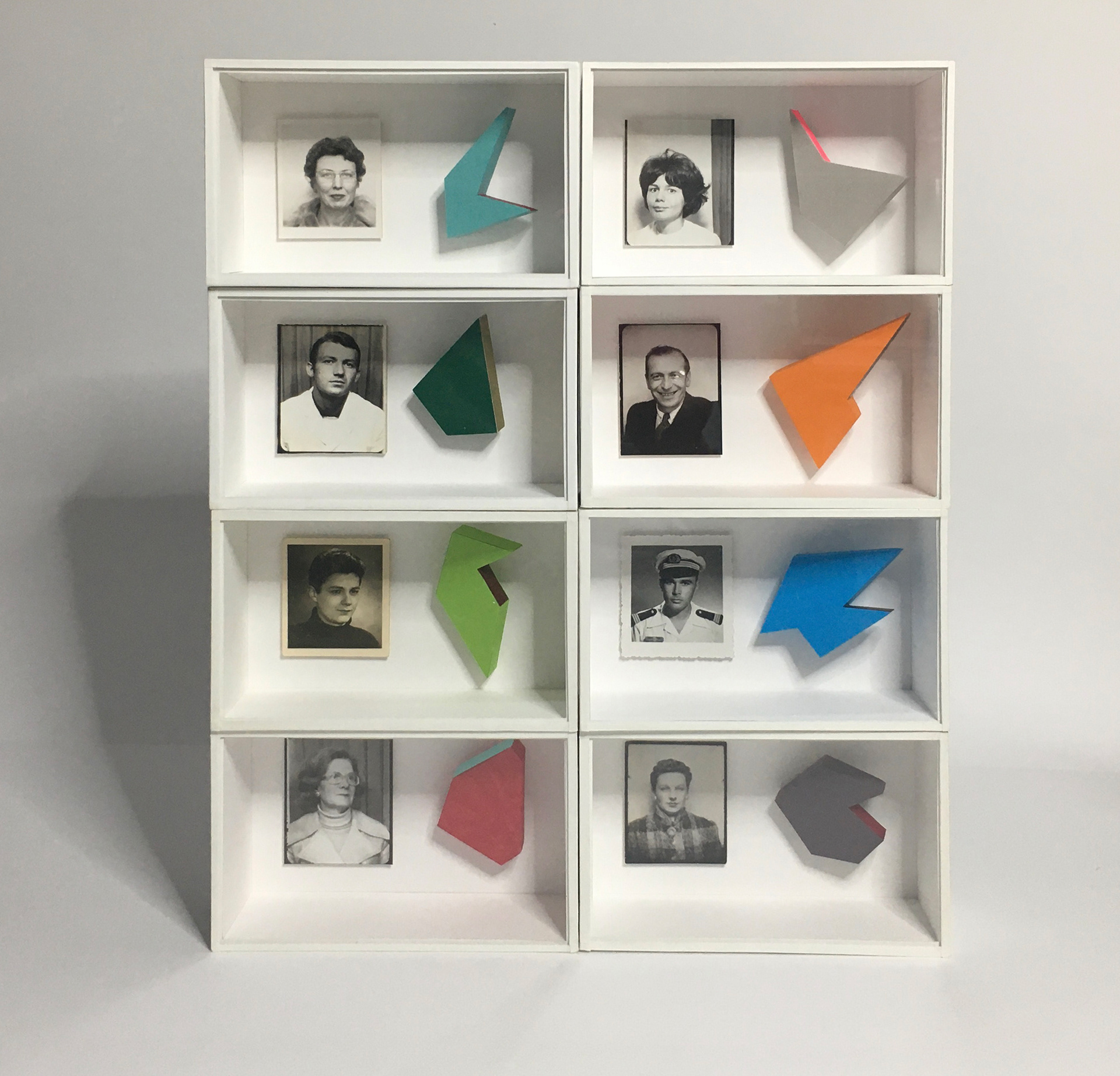 Série avec des photomatons et des formes géométriques en papier découpé. De nouveau des formes simples, géométriques, et abstraites, symboles de l’expression d’une personnalité. 2016